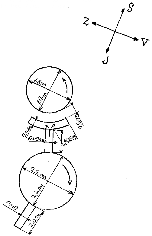 The next was found not far from Vestec, by Jaromer, on 3th September 1994. We were able to research this formation in detail (fig.2). It consisted of: one large circle in the centre - its diameter was 7m, a whorl and 4 lesser circles - their diameters were 3.2 m. Circles were arranged like number five on the die. The formation was in alfalfa (lucerne). There were some interesting things before appearing of this formation. Maybe, these things are connected with appearing, maybe not. These were eg. on11th September at 22:10 an object was watching over the field, where the formation was found. The object let down an orange light beam. This beam faded away (from left upper corner towards the field) and at the end it quite disappeared.